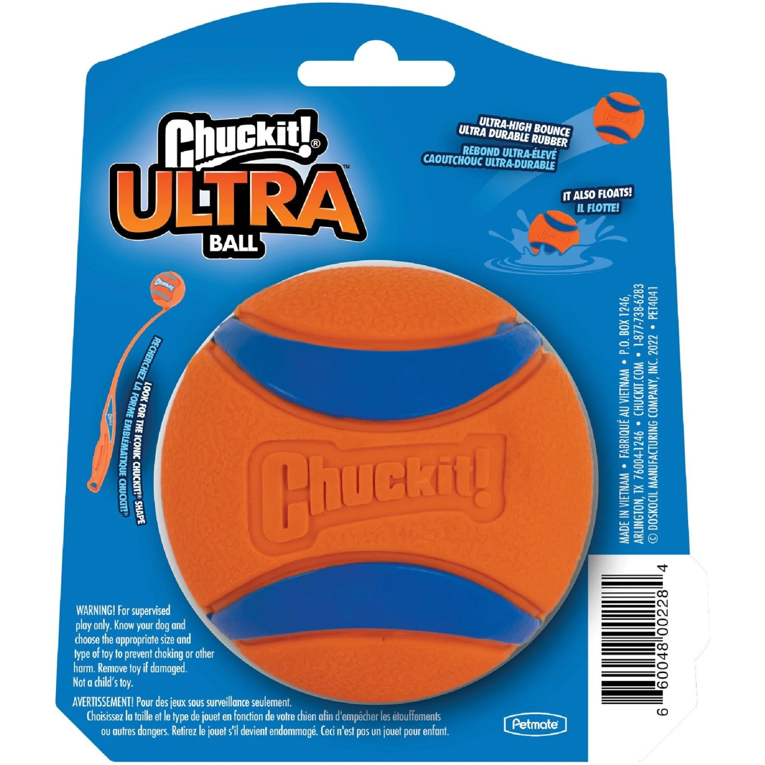 Chuckit! Ultra Rubber Ball Tough Dog Toy, X-Large—The Chuckit! Ultra Rubber Ball Tough Dog Toy is su-paw tough, perfect for games of fetch. The extra-thick rubber core makes it durable, and the ball floats for use in water. It bounces high for extra paw-some fun, and its bright colors make it extra visible, too. It’s compatible with Chuckit! Launchers (sold separately) and is available in multiple sizes.