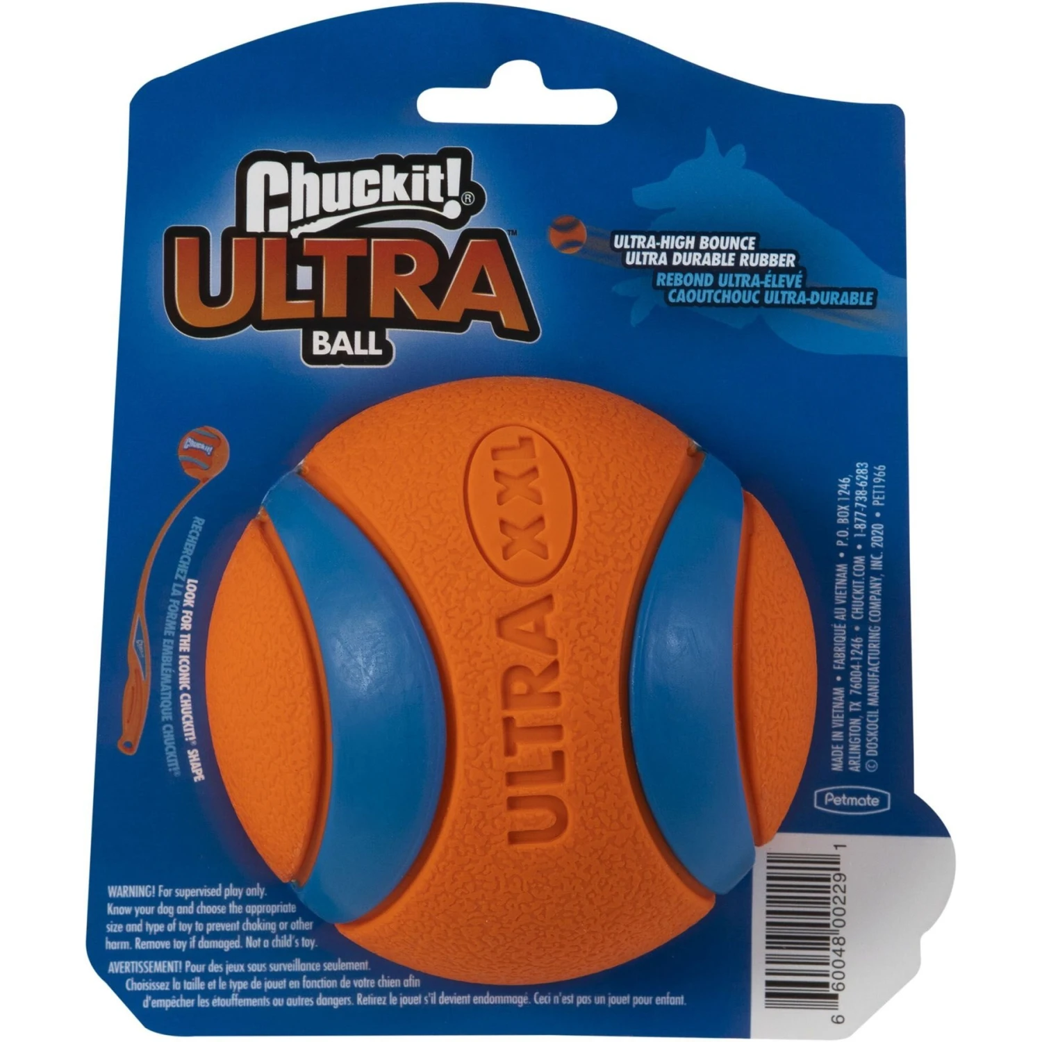 Chuckit! Ultra Rubber Ball Tough Dog Toy, XX-Large—The Chuckit! Ultra Rubber Ball Tough Dog Toy is su-paw tough, perfect for games of fetch. The extra-thick rubber core makes it durable, and the ball floats for use in water. It bounces high for extra paw-some fun, and its bright colors make it extra visible, too. It’s compatible with Chuckit! Launchers (sold separately) and is available in multiple sizes.