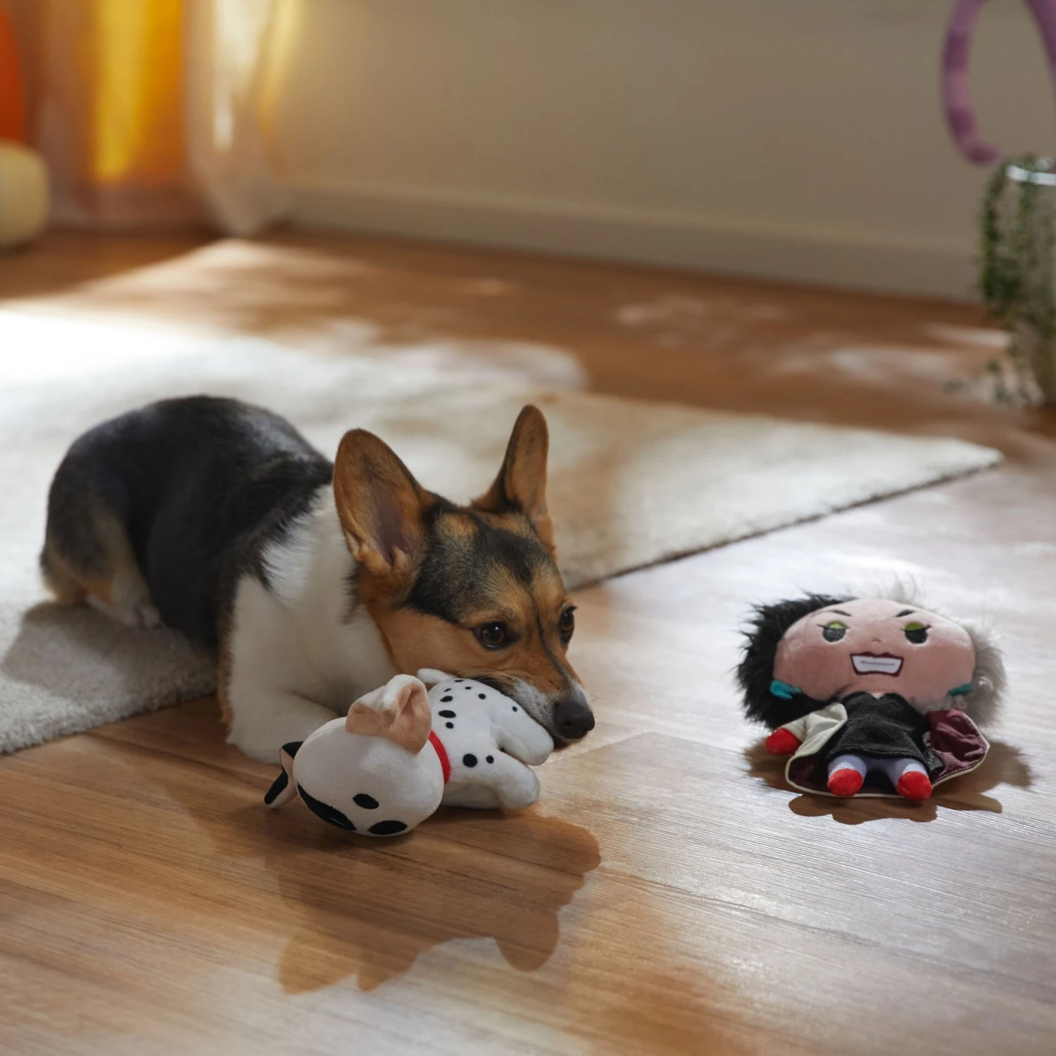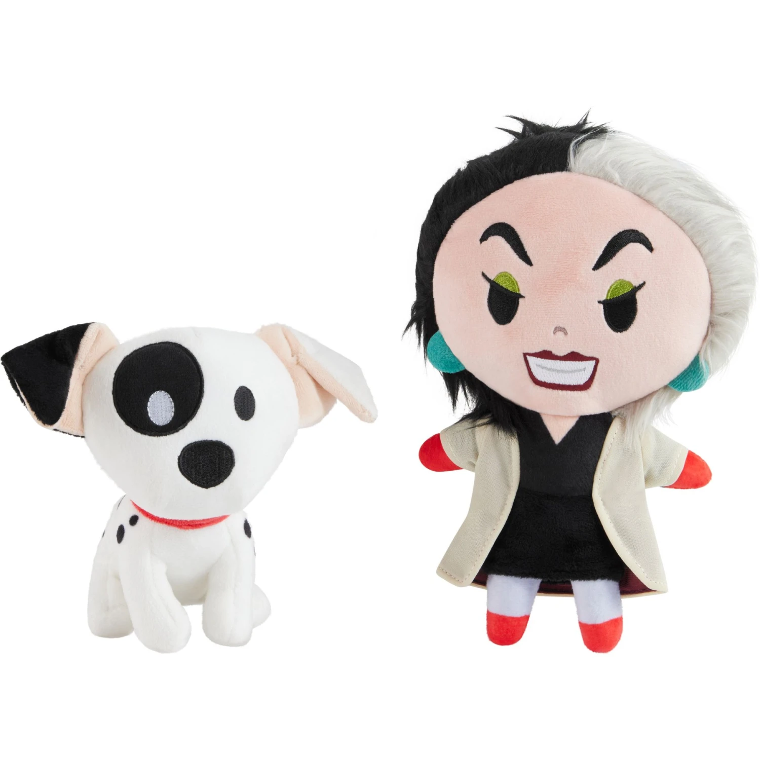 - Two plush squeak toys in one featuring Disney Villain Cruella de Vil and one of the Dalmatians—from The Disney Collection, available only at Chewy.