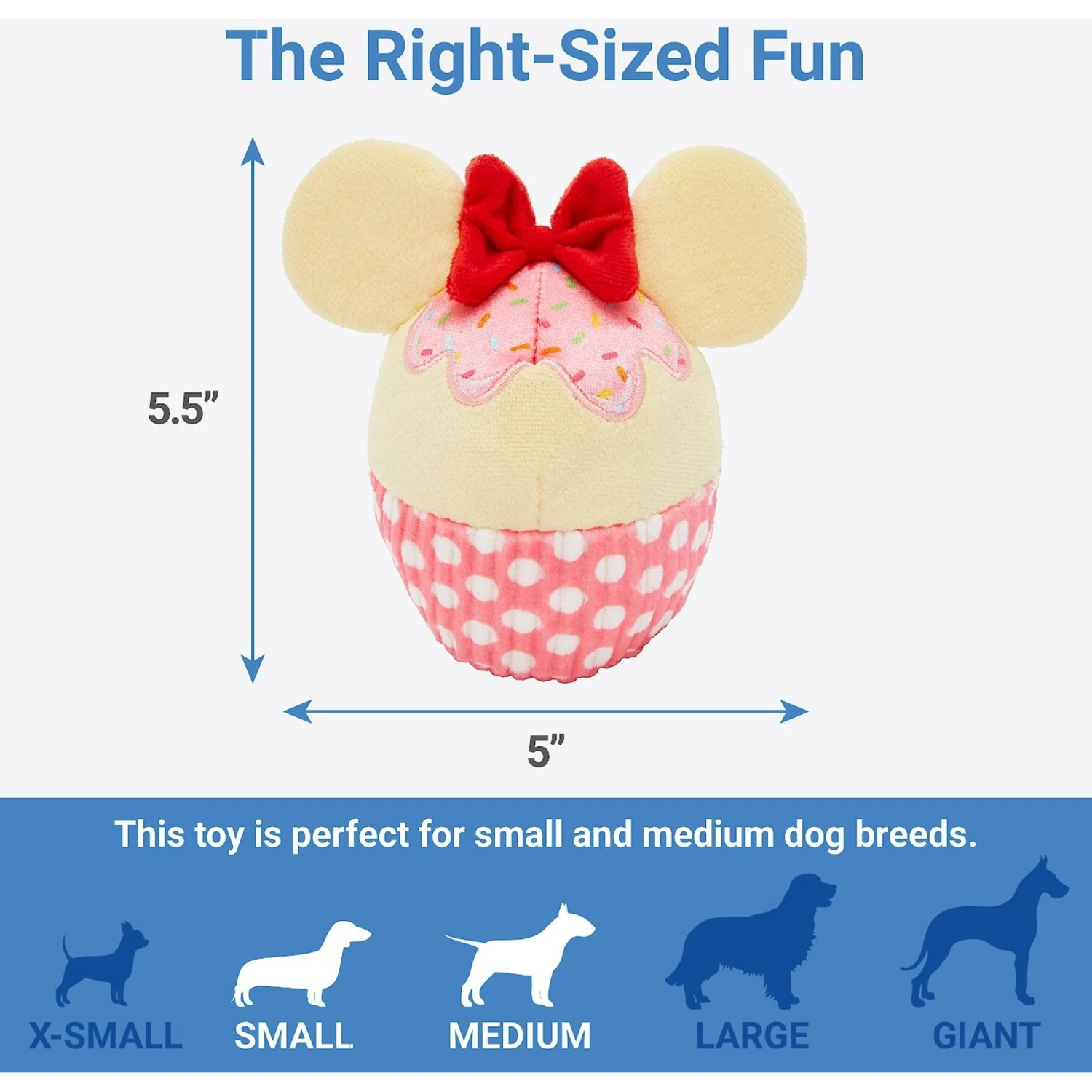 - Cupcake-shaped Minnie Mouse plush toy makes a fantastic addition to your pup’s toy box.