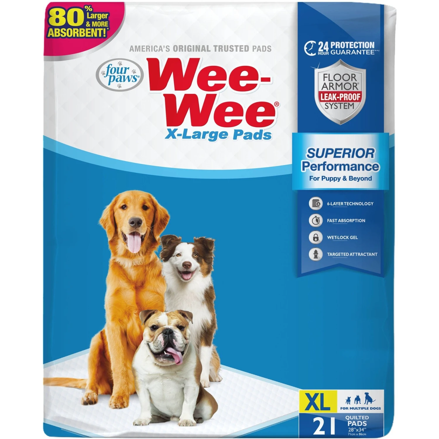 Wee-Wee Extra Large Puppy Pee Pads, 28 x 34-in, Unscented—Wee-Wee Extra Large Puppy Pee Pads are 80% larger and more absorbent than your average dog training pads. These heavy-duty pads have a 6-Ply Leak-Proof Floor Armor System, trap in wetness with a quilted top layer and feature two moisture-locking layers for maximum absorption. These pee pads also have a leak-proof backing to keep your floors nice and dry! All Wee-Wee dog pee pads also include a targeted attractant to draw your paw-tner to the pad and prevent potty training accidents elsewhere. Each Wee-Wee Extra Large Puppy Pee Pads measures 28 inches x 34 inches and is paw-fect for furry friends of all sizes and homes with multiple canine companions!