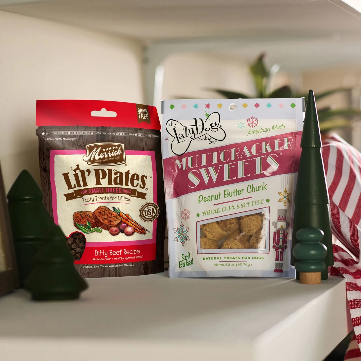 Merrick Lil’ Plates Bitty Beef Recipe Grain-Free Dog Treats, 5-oz bag; Lazy Dog Muttcracker Sweets Peanut Butter Chunk (Treat flavor may vary); Frisco GB Holiday Snowman Plush with Rope Squeaky Dog Toy, Small/Medium; Frisco GB Holiday Penguin Plush Squeaky Dog Toy, Small/Medium; Frisco Holiday Striped Pet Stocking