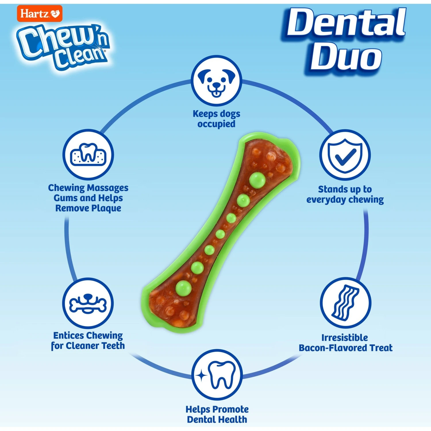 Give your pooch two times the fun with Hartz Chew ‘n Clean Dental Duo Dog Treat & Chew Toy! It helps minimize plaque and tartar while gently massaging gums as your furry friend chews. Safe and long lasting, this toy treat is made with a durable nylon shell that holds up to lots of chewing. Featuring a delicious, bacon-flavored edible center, your best pal will chew on his toy and not your furniture. The paw-fect size and strength for your small-breed dog, the unique two-in-one design offers the chewing fun of a toy and the paw-some taste of a treat!