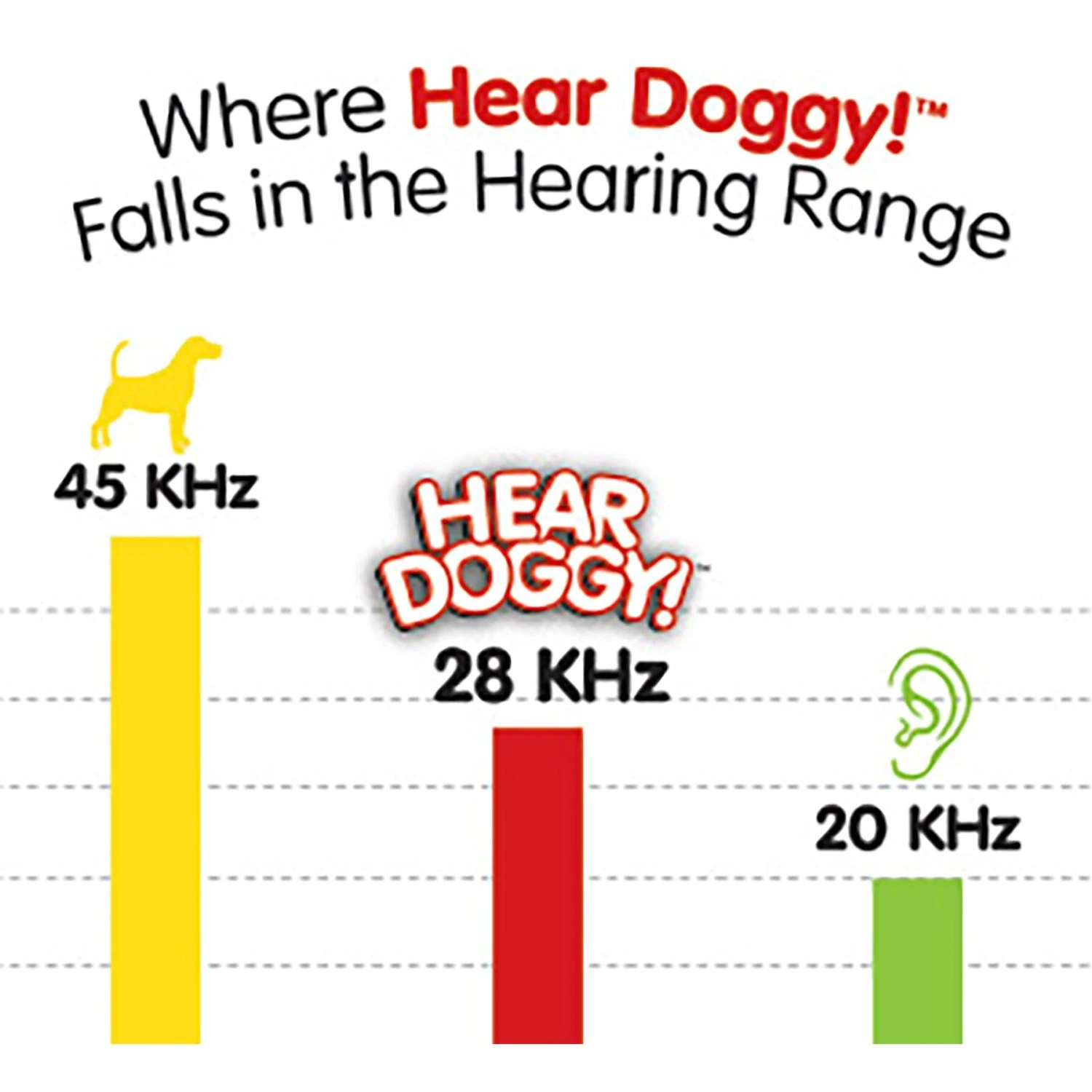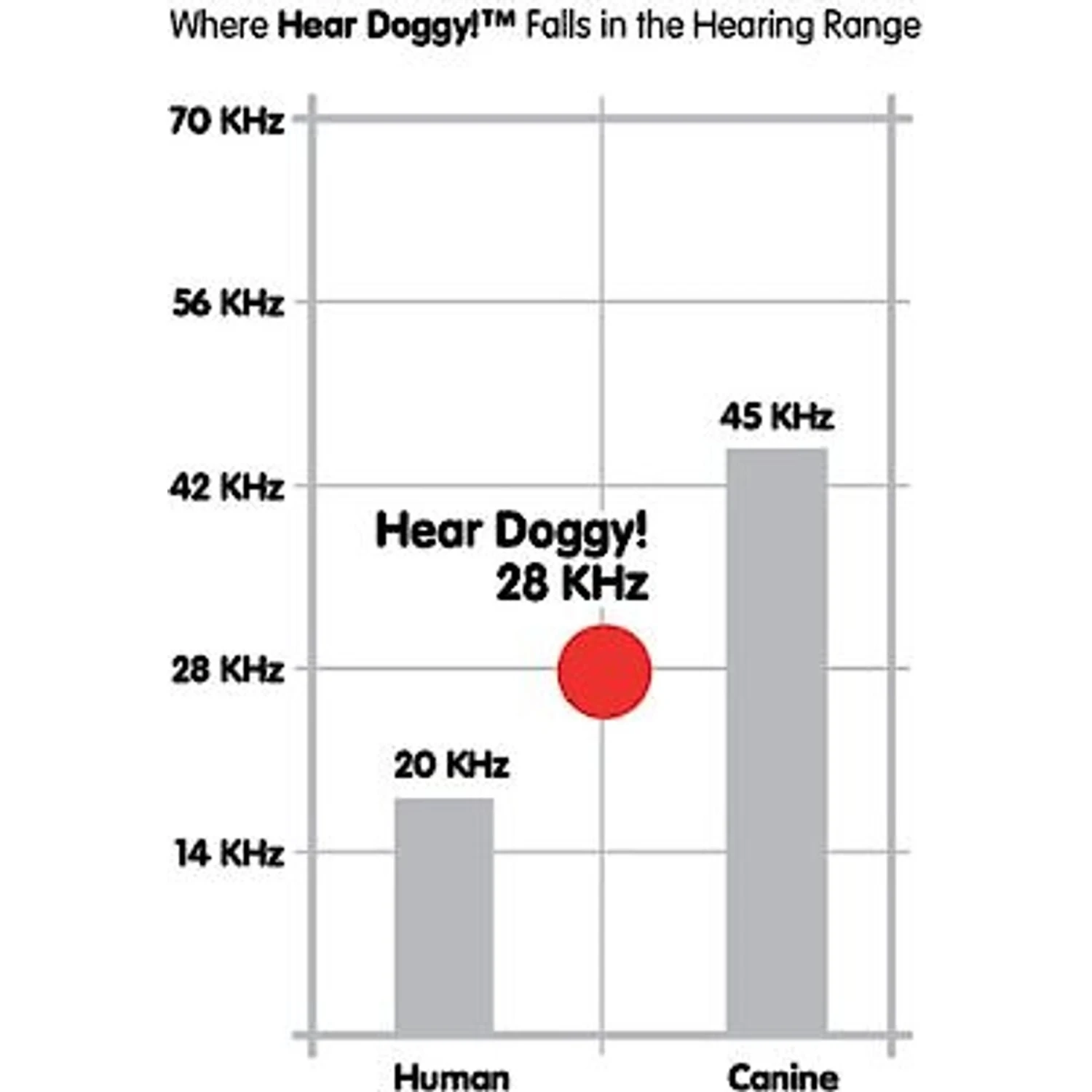 - Dogs can hear sounds at a higher frequency (0 to 45KHz) than humans (0 to 20 KHz) so Hear Doggy! toys are made with a squeaker tuned to an ultrasonic range in the 24-28 KHz frequency, that only dogs can hear, so no more enduring the high-pitched repetition of annoying squeakers
