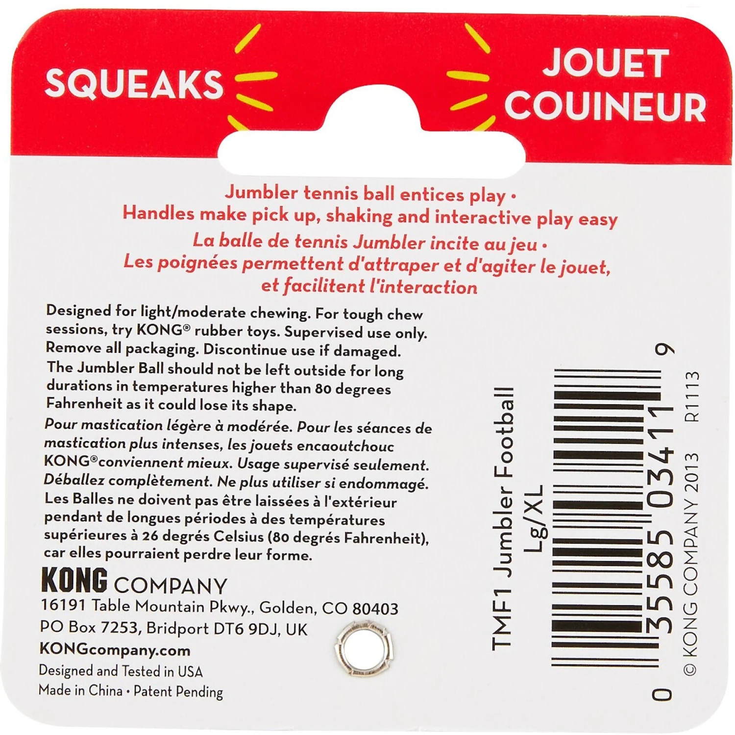 The KONG Jumbler is a two-in-one ball toy for twice the interactive fun. The interior tennis ball and loud squeak entice play, while the handles make pickup and shaking easy. The Jumbler stands up to tough play, making it ideal for games of fetch. Available in two shapes and sizes, the KONG Jumbler will ensure an exciting, active play session for you and your dog.