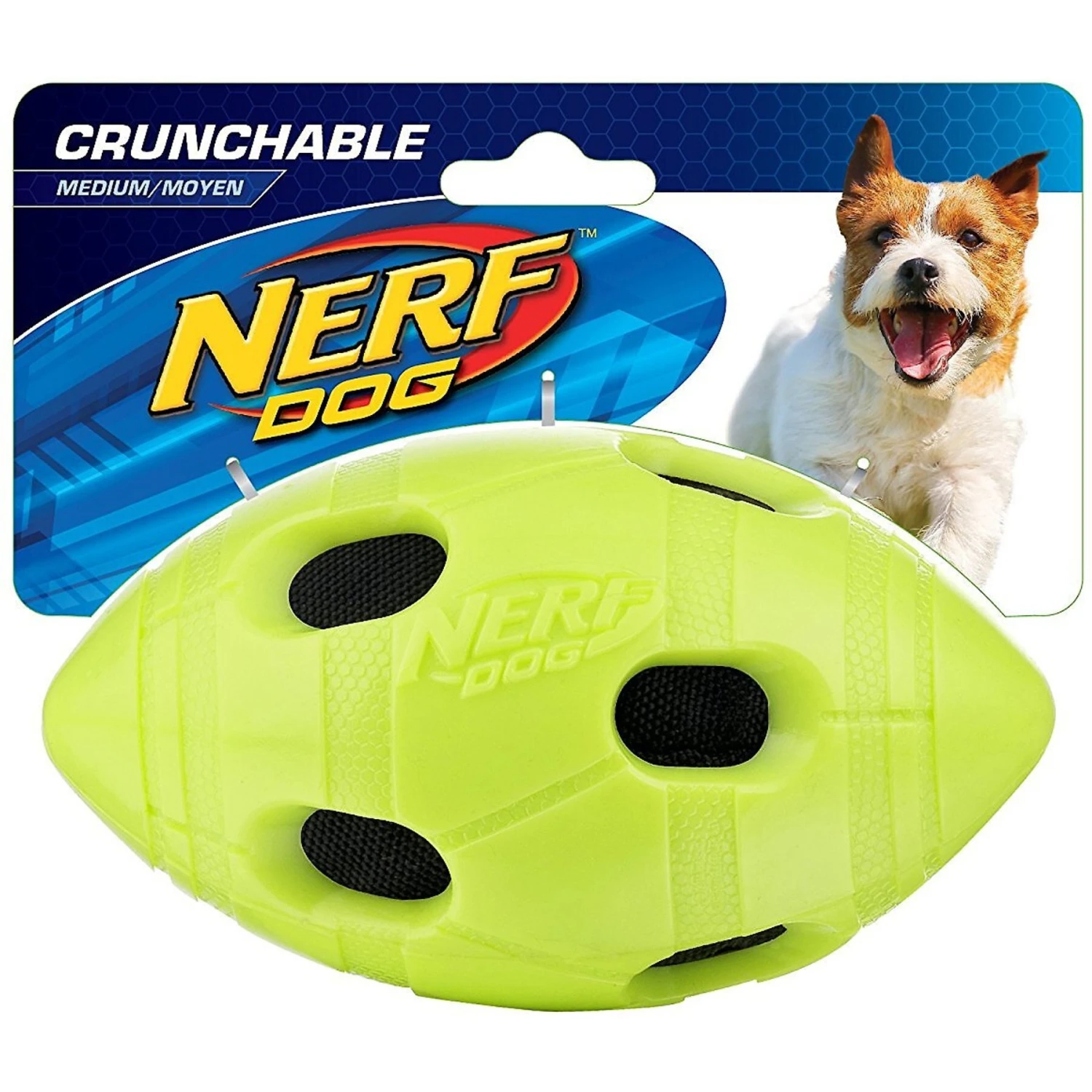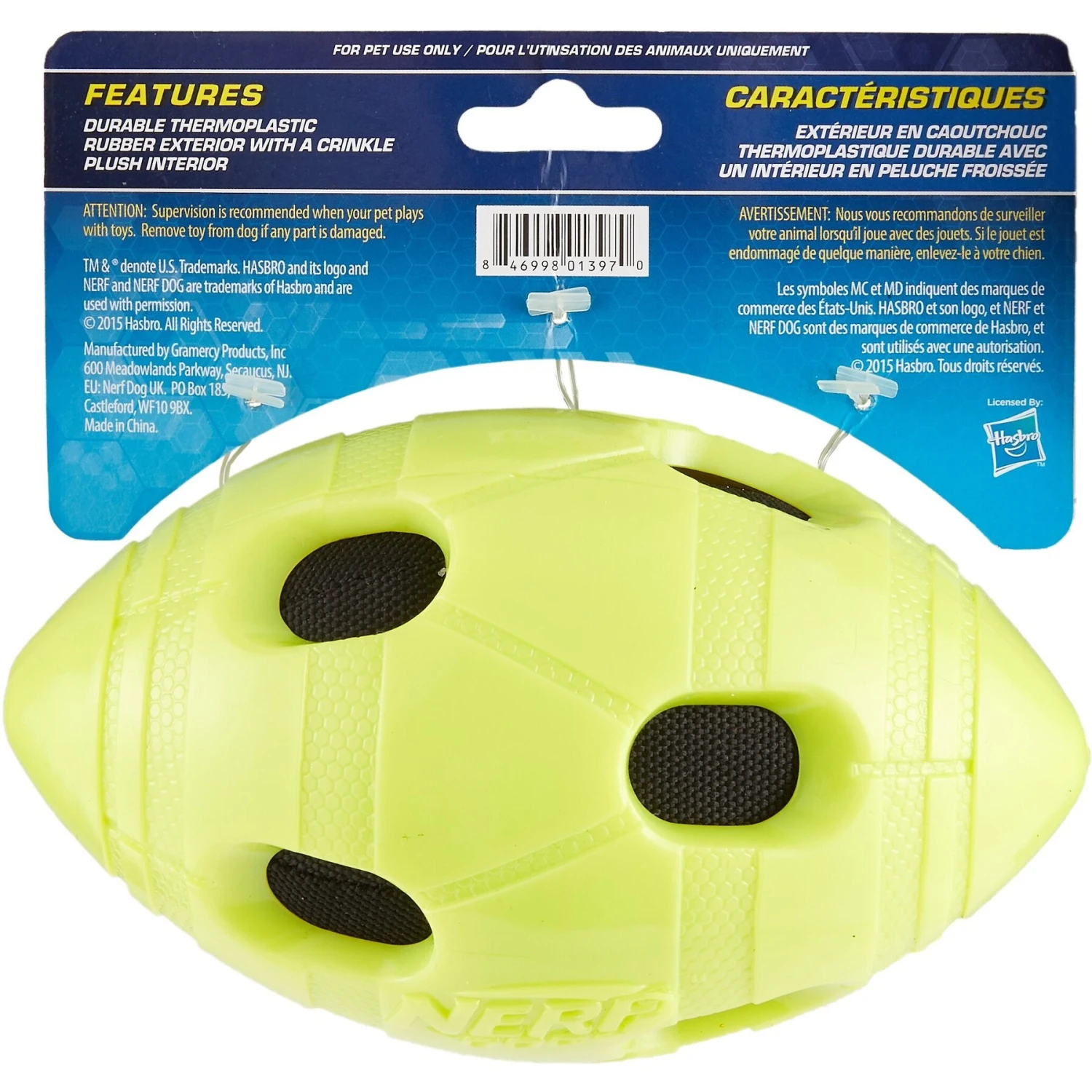 Take your game of fetch to the next level with the innovative Nerf Dog Crunchable Football Dog Toy. This interactive toy has two different exciting textures. Inside is a nylon material with an intriguing center that makes irresistible crunching and squeaking noises when your pup catches it. The rubber exterior gives you a good grip so you can throw the Crunchable Football even farther. At six inches long and four inches wide, it’s just the right size for throwing the perfect spiral. It’s water- and weather-resistant to stand up to water, mud, rain, drool or sweat. And it floats in water, so you can have fun at the beach or in the pool. It’s a crackling, rolling, dog-worthy and overall exciting retrieval toy.