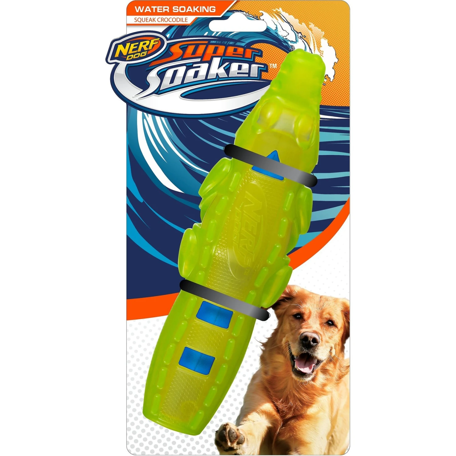 Give your energetic pal a durable, splash-friendly toy optimized for extra-tough tossing and fetching with the Nerf Dog Super Soaker Squeak Crocodile Dog Toy. It’s built with special materials to withstand hours of play like thermoplastic rubber and a crinkle plush interior with squeakers to make playtime that much more exciting. Your pal will love the squeaking sounds and the Super Soaker design that’s ready for water play anytime you are! Plus, thanks to its aerodynamic stick shape, it’s the perfect toy for on-demand games of fetch indoors, at the park, or at your favorite spot.