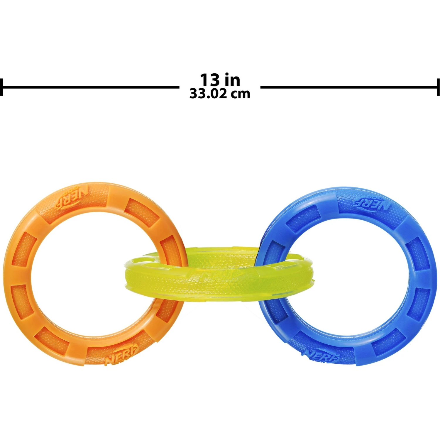 Give your energetic pal a durable toy optimized for extra-tough tugging and roughhousing with the Nerf Dog Tuff Tug 3 Ring Dog Toy. Thanks to its unique design with two durable rubber rings, it’s perfect for action-packed games of tug your pal can enjoy with you, or with other friendly pups. It’s built with high-performance thermoplastic rubber to stand up to extended rounds of fetch and tugging, so it’s the go-to toy for active pups. When it’s time to relax and store the toy, cleaning doggie drool and dirt is a cinch by just hand washing or wiping away. Plus, thanks to its waterproof design, it’s ideal for water-loving pups at the beach, lake, pool, or your favorite spot!