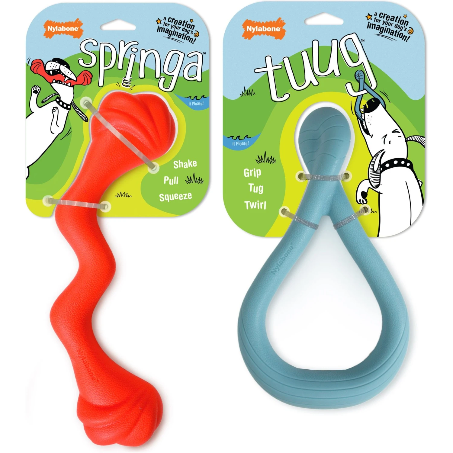 Chewing isn’t all your dog does! Nylabone’s Creative Play Springa and Tuug Interactive Dog Toys Bundle is designed to tap into your fur kid’s creative potential. After all, a dog’s mind is like a young child’s—you simply need the right toys to unleash that imagination! With an inspiring variety of shapes, textures and materials, these play toys for dogs will motivate both you and your dog to discover new ways to play together. The possibilities are amusingly endless!