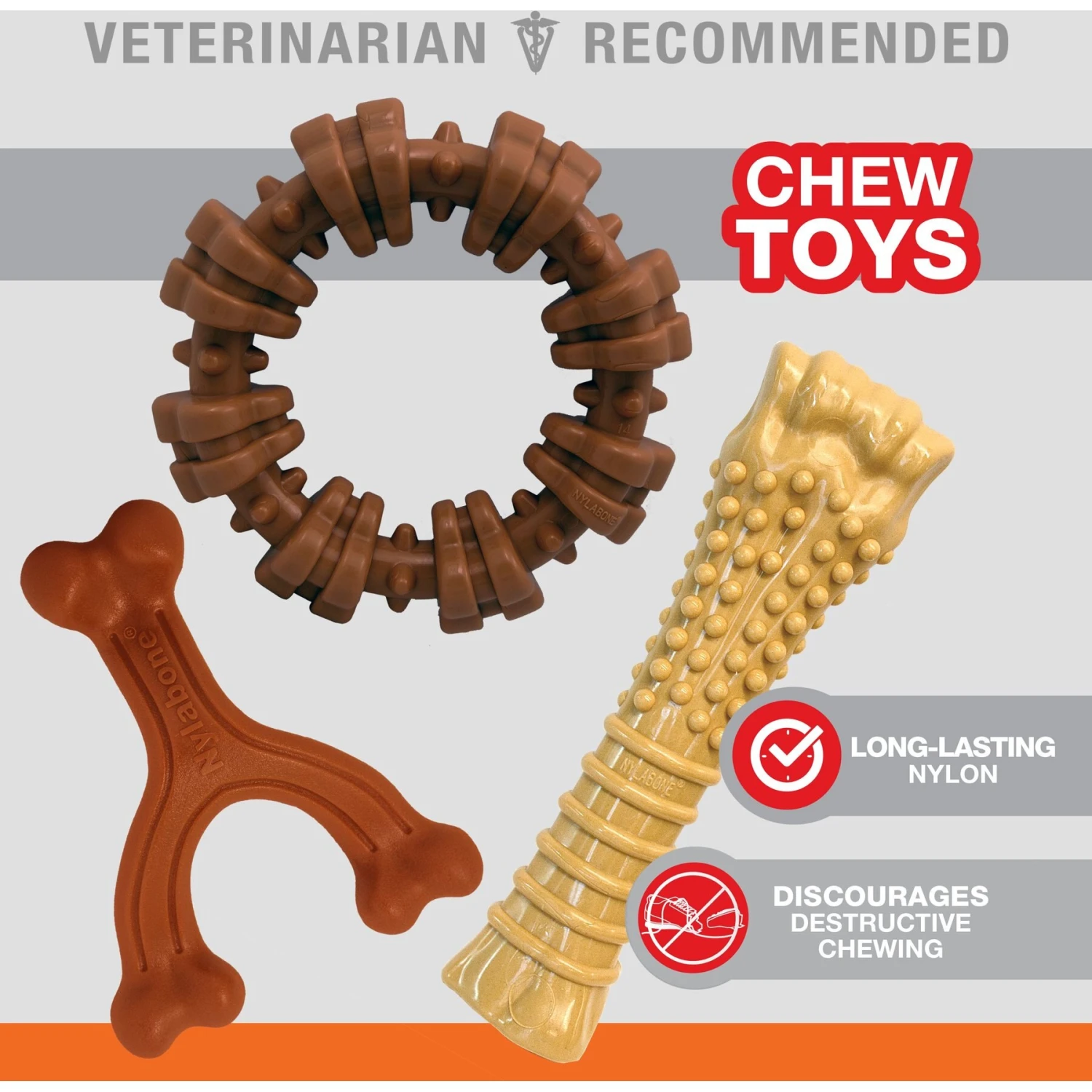 - Includes three of Nylabone’s most popular Power Chew toys.