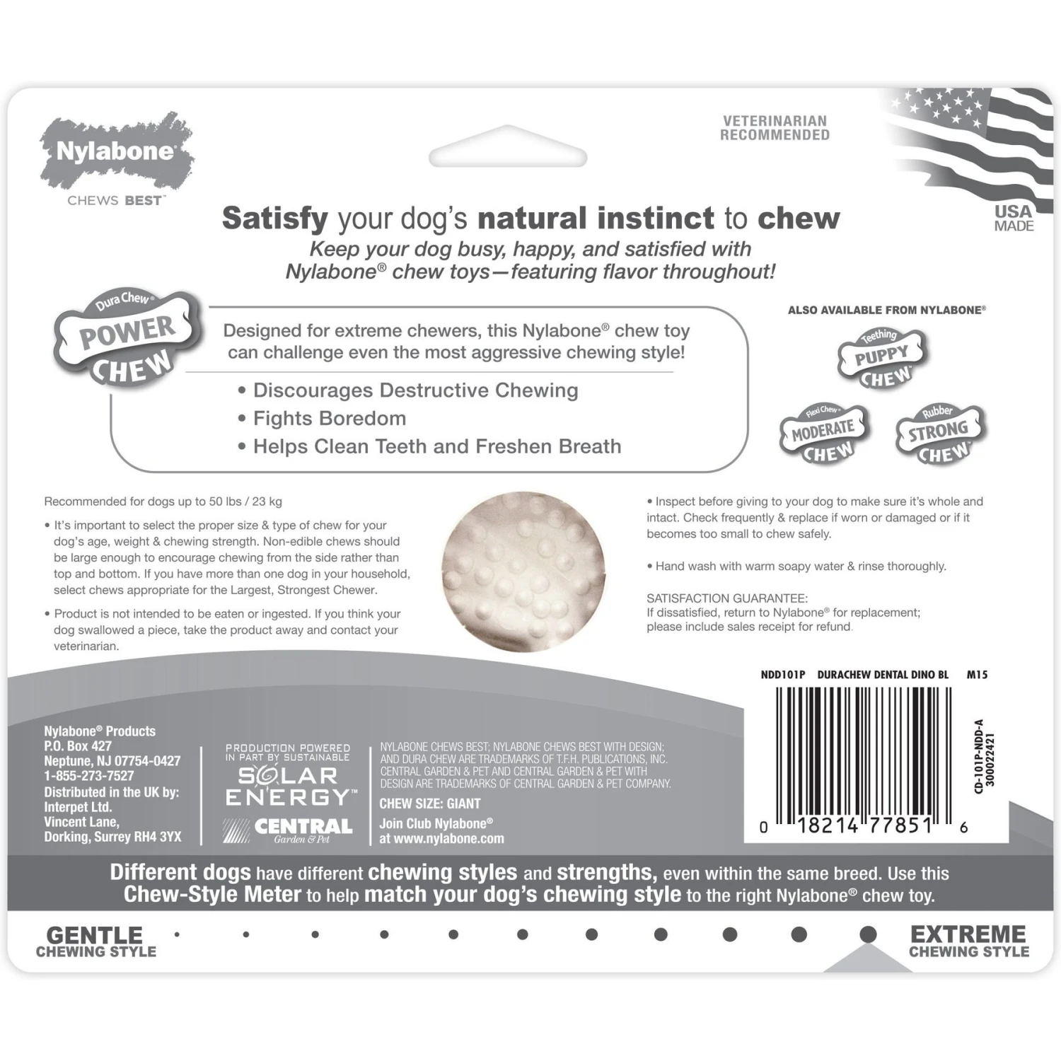Powerful chewers need powerful chew toys! Nylabone’s Power Chew Dental Dinosaur Dog Toy helps satisfy your dog’s prehistoric urge to chew with an irresistible chicken flavor throughout. This dental chew toy features gently rounded nubs and bristles that raise during chewing. They promote clean teeth, help control plaque and tartar buildup, massage gums, and freshen breath as your dog chews. Made of tough, durable nylon, this long-lasting chew stands up to even the most aggressive chewers. Your dog will stay occupied for hours, discouraging destructive chewing. Reward your dog with this din-o-mite chew toy!