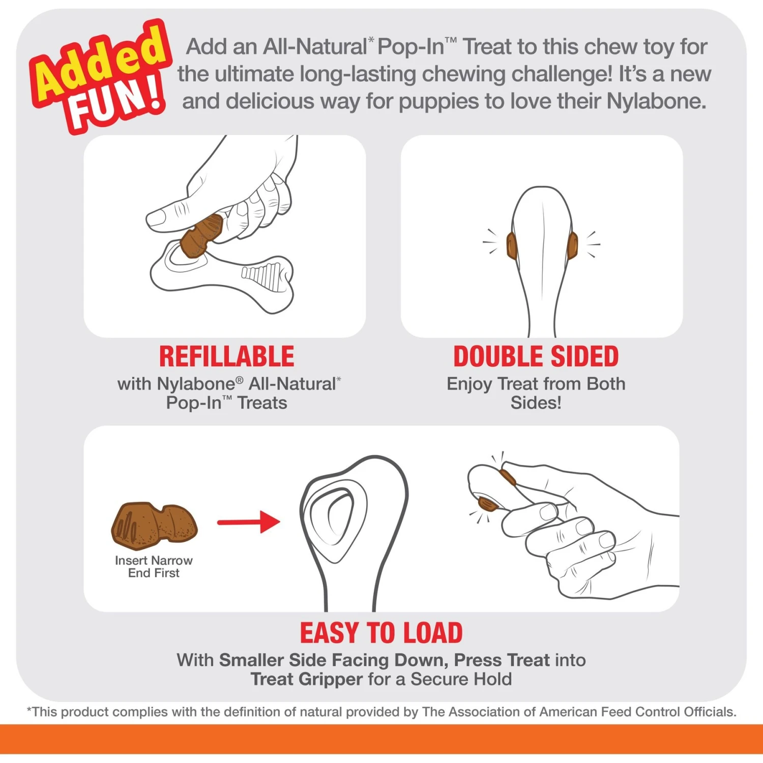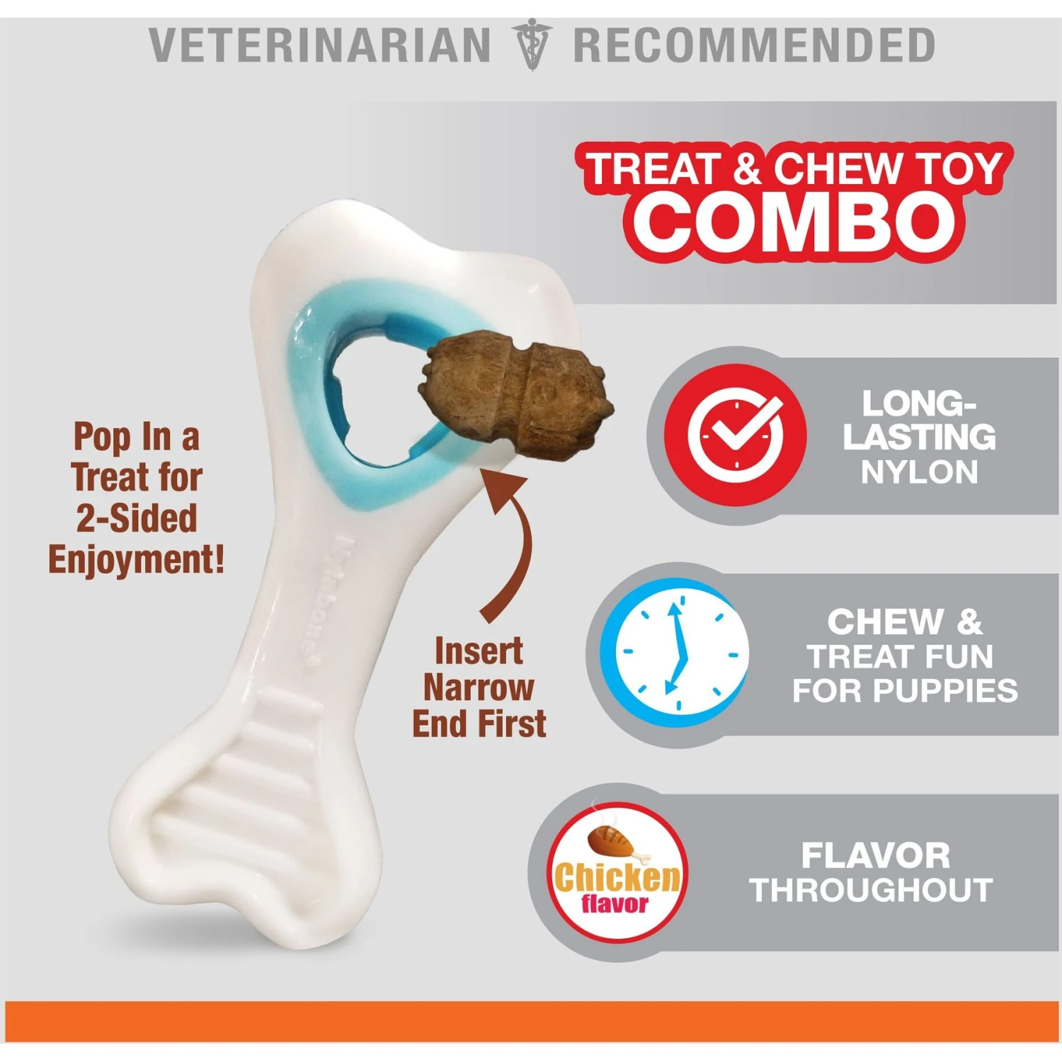 Provide your pup the ultimate chewing challenge with the Nylabone Puppy Power Chew Knuckle Bone & Pop-In Puppy Treat Toy Combo Chicken. Made with super-durable material, this chicken-flavored, chew toy is designed to give long-lasting flavor and fun to puppies with serious bite. This refillable chew toy also features ridges and nubs that help clean your new furbaby’s teeth as he chew. Plus, it includes All-Natural Pop-In Treats that fit securely in the treat grippers, allowing your little furry friend to enjoy the treat from both sides of the toy. Each limited-ingredient chicken dog treat is highly digestible and made in the USA. Whether you want to challenge your powerful puppy or simply take his chewing fun to a new level, this chew and treat toy will keep him happily occupied!