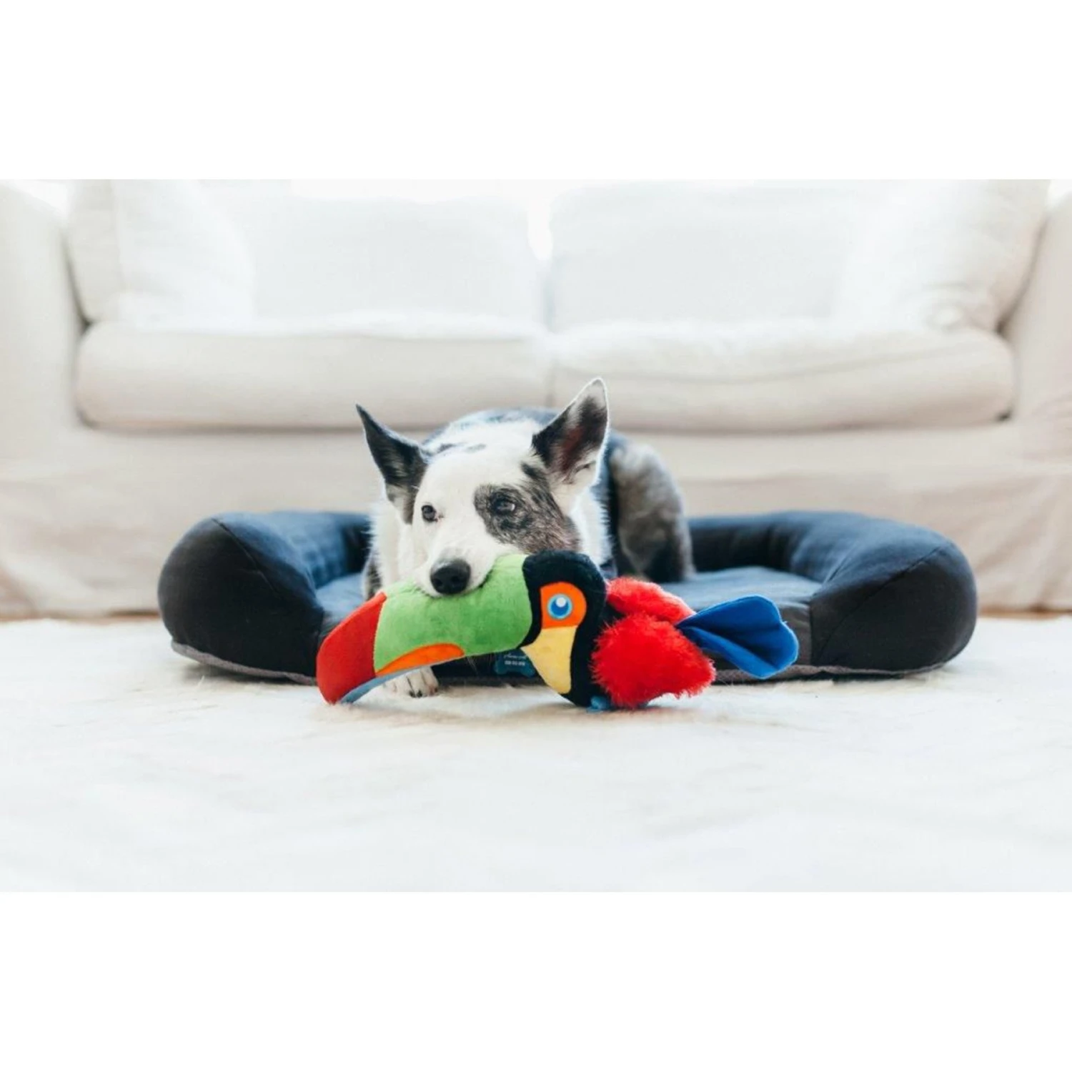 Give your pooch some fetching feathered fun with the P.L.A.Y. Pet Lifestyle And You Fetching Flock Collection Tito The Toucan Plush Squeaky Dog Toy! This large plush toucan has multiple crinkles and a center squeaker. Created by hand with a double-layer exterior and reinforced stitching for extra durability, this su-paw entertaining plush includes an added protective lining to prevent messy cleanups after a rough play session. The eco-friendly filler is made from 100% post-consumer, certified-safe recycled plastic bottles. Made machine washable and dryer friendly, it’s also crafted using the same quality standards used for children’s products, ensuring exciting, good-time fun.
