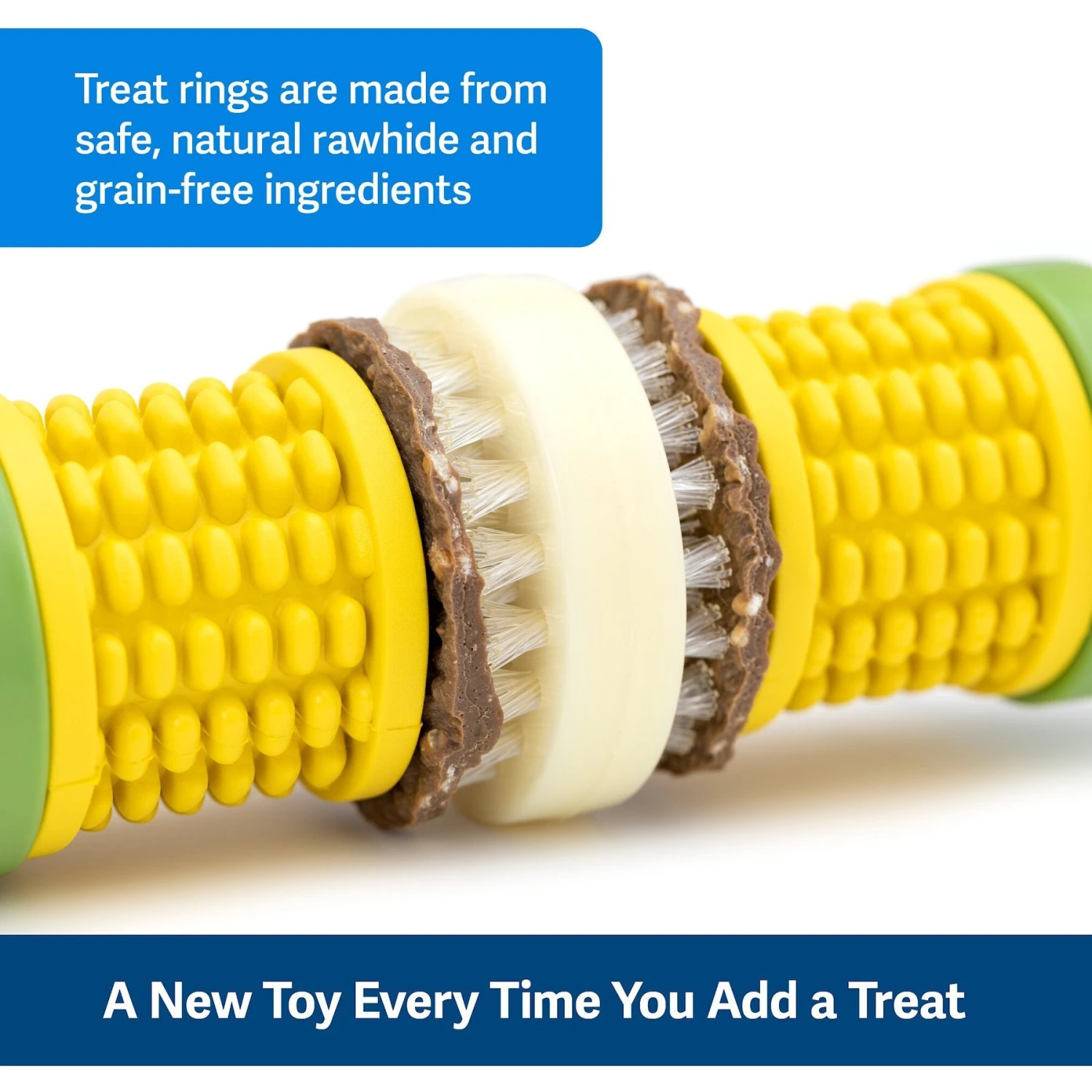 Let your best buddy join in on the family barbecue fun with this PetSafe Busy Buddy Cravin’ Corncob Chew Dog Toy! Simply place up to two treat rings on the toy by unscrewing the ends and sliding them on. For an additional treat and to keep your canine companion entertained, you can smear nut butter (or doggie toothpaste) on the corn kernels! The textured surface helps prevent and removes build-up as your pup chews, keeping her teeth and gums clean. This toy is essentially a clever toothbrush that looks and tastes like a snack! The BPA-free rubber is butter scented to keep your dog happy even after the treat rings are gone. Plus, the toy is top-rack dishwasher safe for easy cleaning.