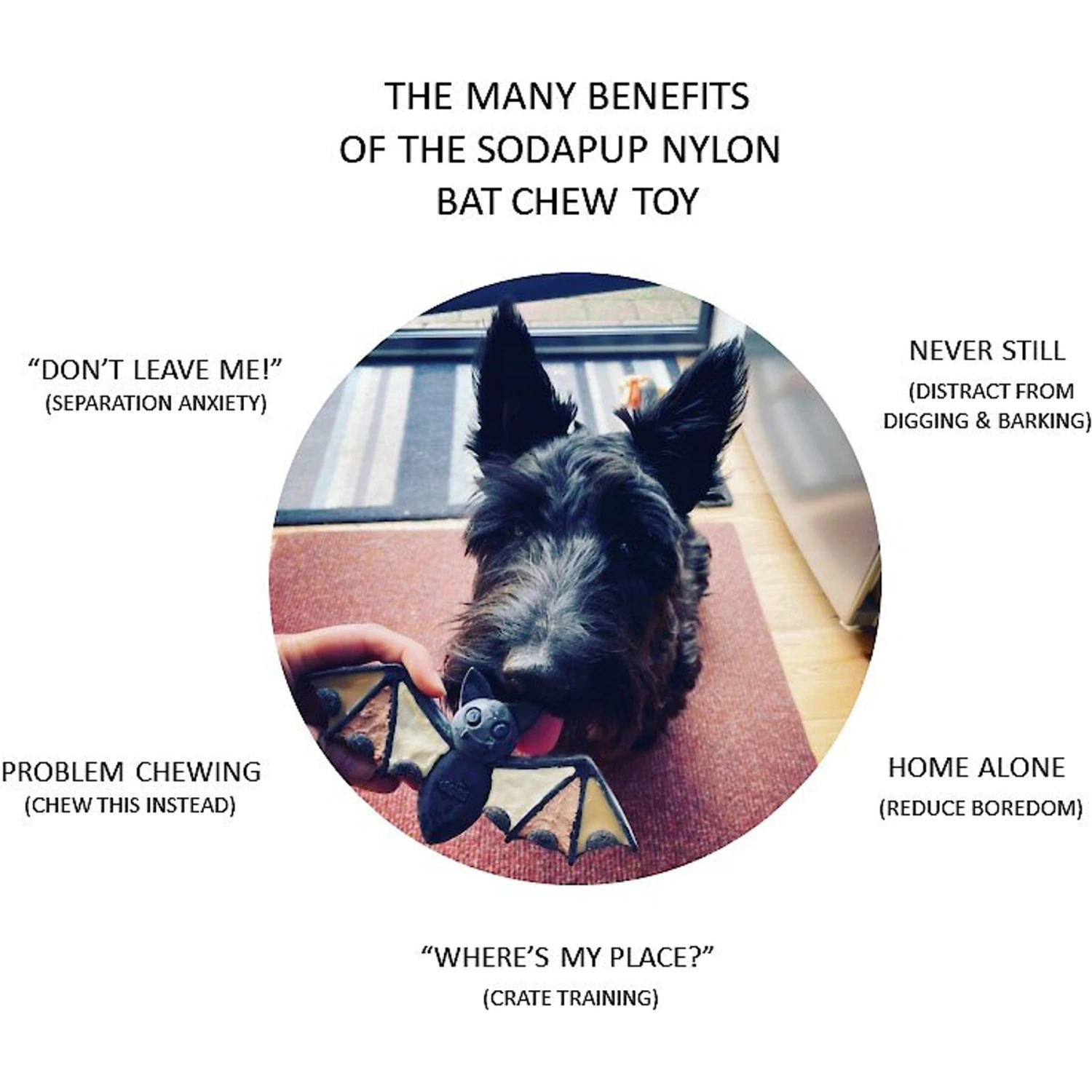 Your dog will be a sucker for this chew! The SodaPup Nylon Vampire Bat Chew Dog Toy adds a spooky vibe to playtime. Toss this vampire-shaped chew and watch your dog have tons of fun! This toy is designed with long-lasting materials, which helps it stand up to plenty of play. By keeping your pooch occupied with different shapes and textures, this toy helps ease separation anxiety and persistent chewing. Pet parents rejoice—it even freshens up your canine companion’s breath!